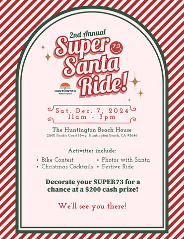 Get ready for the 2nd Annual Super Santa Ride! Join us at The Huntington Beach House for a day of holiday fun. Decorate your SUPER73 for a chance to win a $200 cash prize. Enjoy festive activities, including photos with Santa and Christmas cocktails. Donโt miss out on this holiday extravaganza!